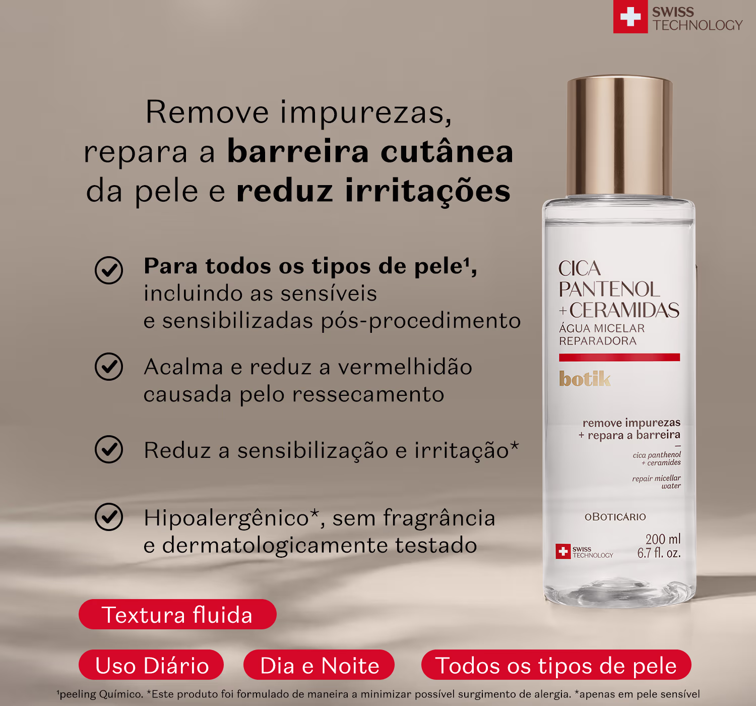 “Pode ser usada como primeiro passo da limpeza ou passo único, sem necessidade de enxague. Uma dica: evite esfregar a pele sensibilizada, use algodão macio e gentileza para um resultado ainda mais confortável.” - Dermatologista Botik.