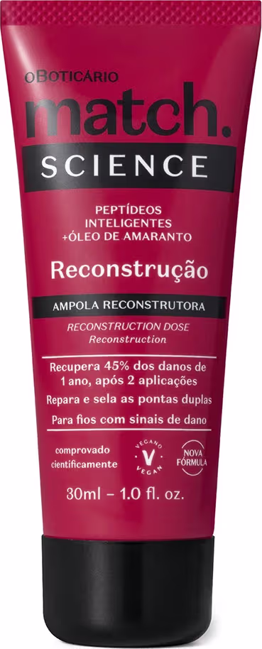 Match Science Reconstrução é a primeira linha da plataforma Match Science. A linha é indicada para quem tem fios danificados pelo uso constante de instrumentos de calor (secador, chapinha, babyliss) e/ou produtos químicos, proporcionando soluções para cada tipo de dano dos fios. Resultados na primeira aplicação, comprovado cientificamente.