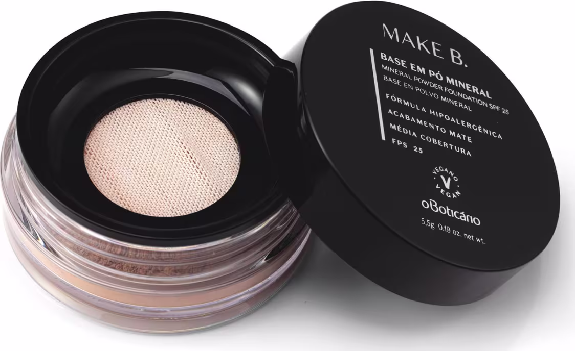 A Base em Pó Mineral Make B. é ideal para todos os tipos de pele, inclusive para a pele sensível. Enriquecida com ingredientes minerais que não agridem a pele, é livre de ceras, fragrância e conservantes, e sua fórmula também possui Oil-Free e FPS25.