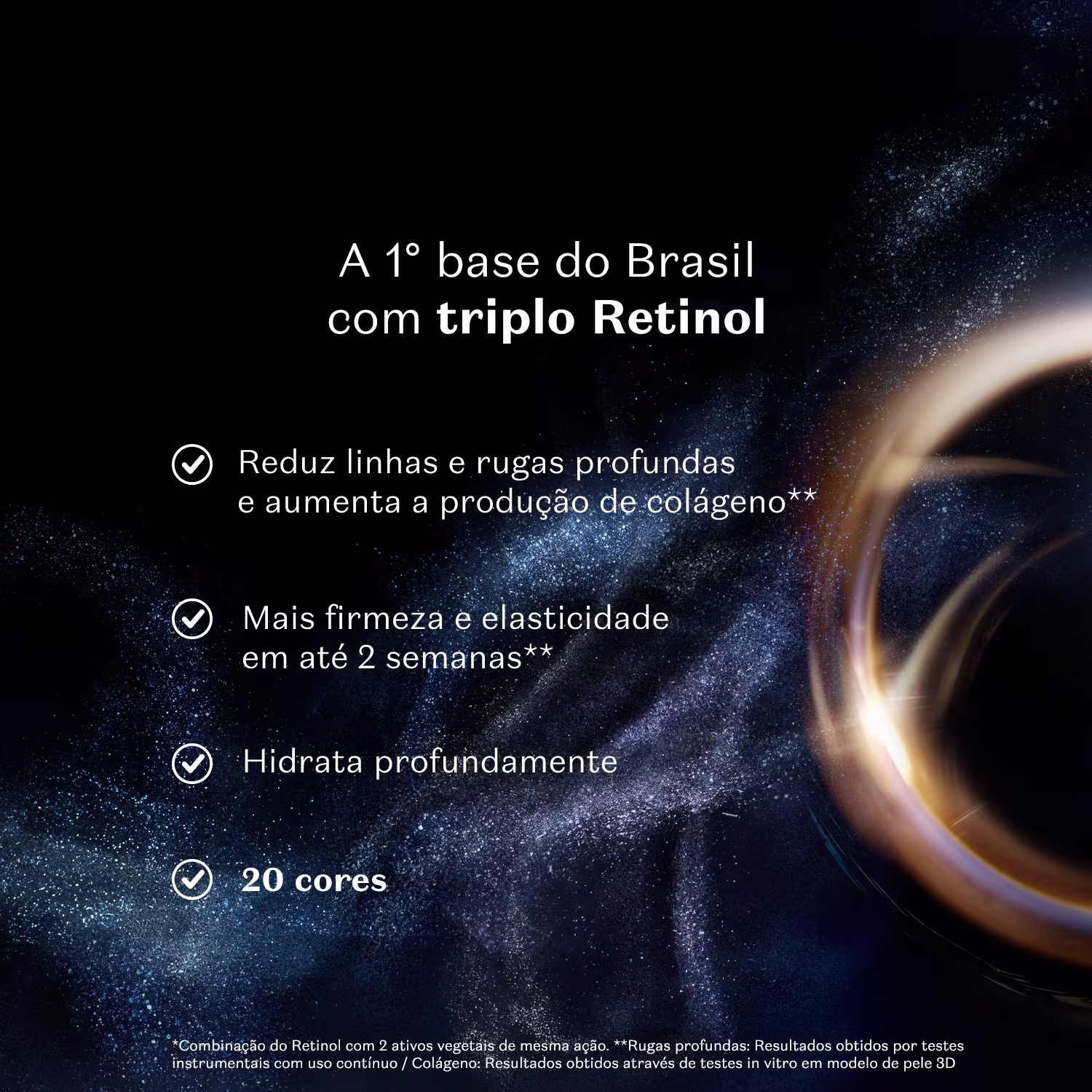 Primeira base do Brasil com triplo retinol: reduz linhas e rugas e aumenta a produção de colágeno. Ver mais ❯