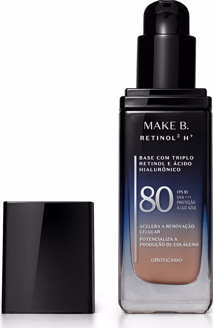 Apresentamos a Base Líquida FPS80 Make B. Retinol³ H+ Cor 140Q, a primeira base do Brasil com Triplo Retinol: reduz linhas e rugas profundas e aumenta a produção de colágeno** , tudo com a mesma fórmula e acabamento que você já conhece.
