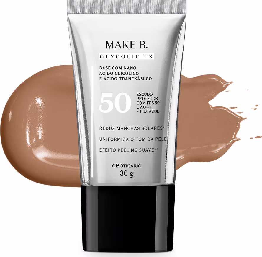 Falar de base Make B. é falar de tecnologia de ponta em seu kit maquiagem. Pioneira em inovação, apresentamos a Base Líquida Make B. Glycolic TX Cor 210, a primeira base do mundo que reduz manchas na pele causadas pelo sol*.