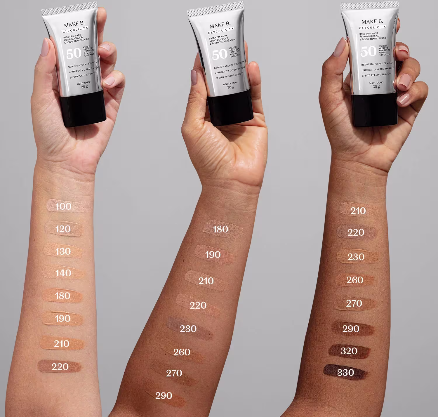 Falar de base Make B. é falar de tecnologia de ponta em seu kit maquiagem. Pioneira em inovação, apresentamos a Base Líquida Make B. Glycolic TX Cor 220, a primeira base do mundo que reduz manchas na pele causadas pelo sol*.