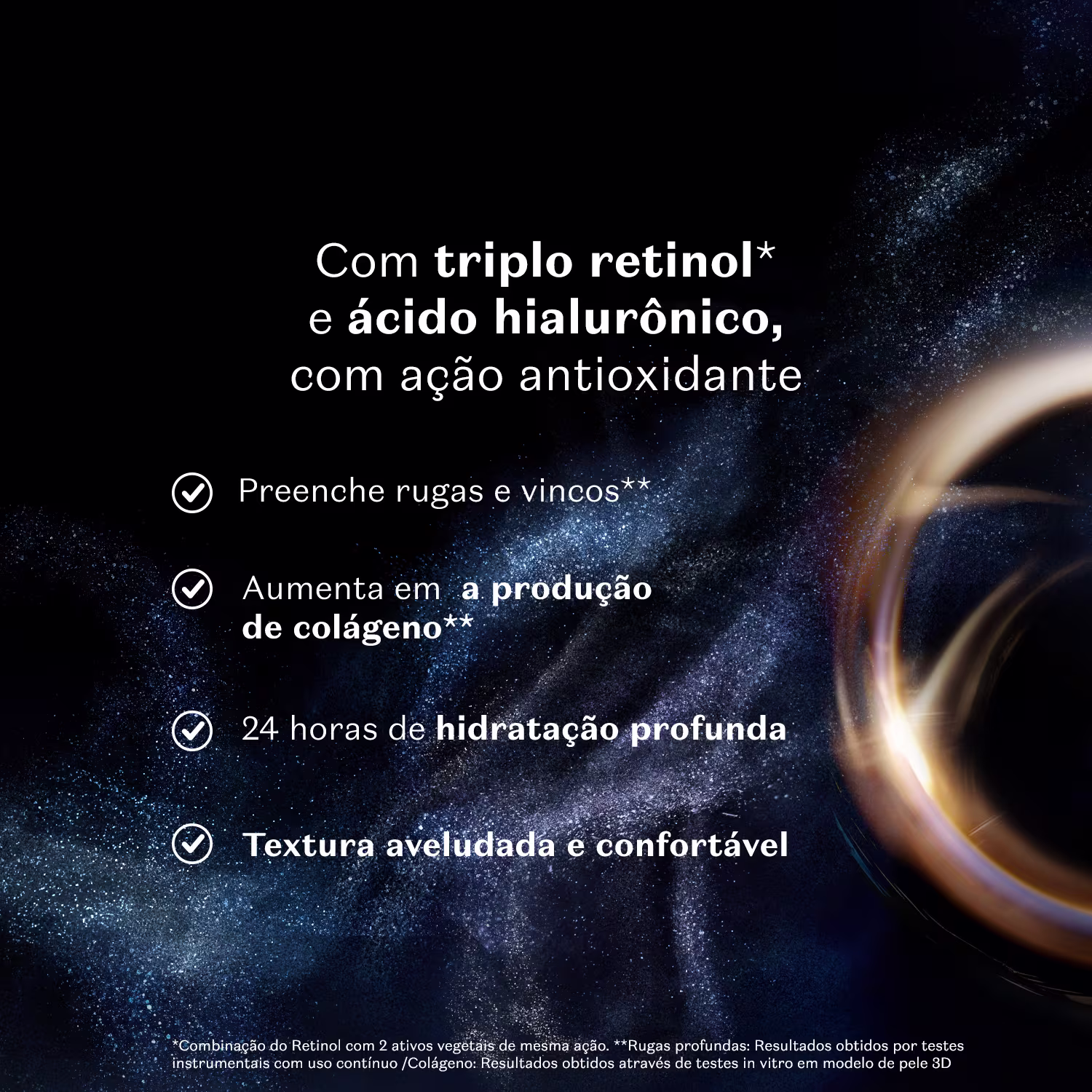 -Com triplo retinol* e ácido hialurônico, com ação antioxidante;