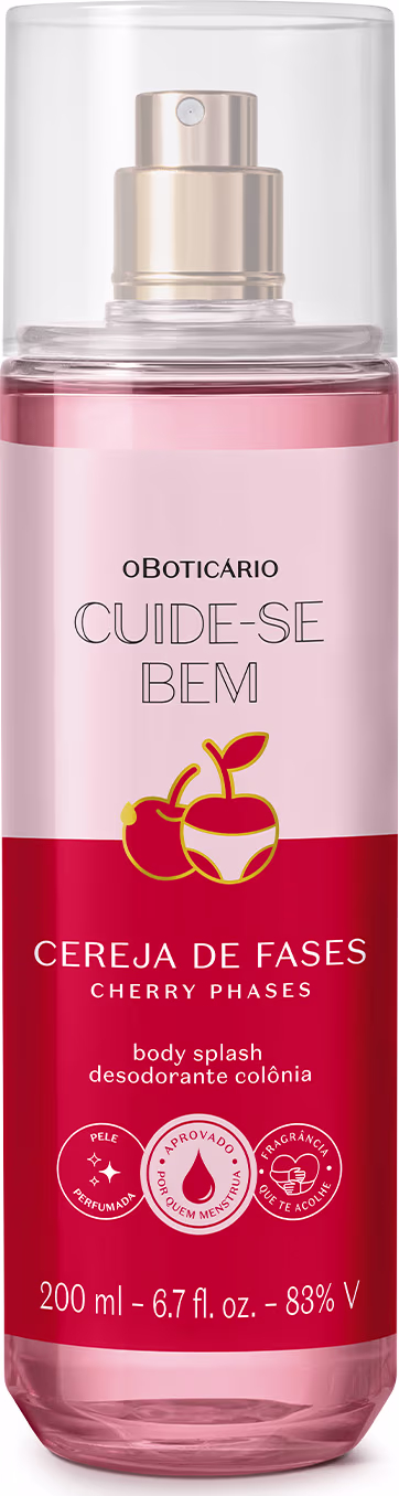 Desenvolvida por neurociência**, a fragrância do Body Splash Desodorante Colônia Cereja de Fases entrega um floriental frutal envolvente, trazendo sensação de alívio físico e emocional e tornando os dias de ciclo mais leves e confortáveis.