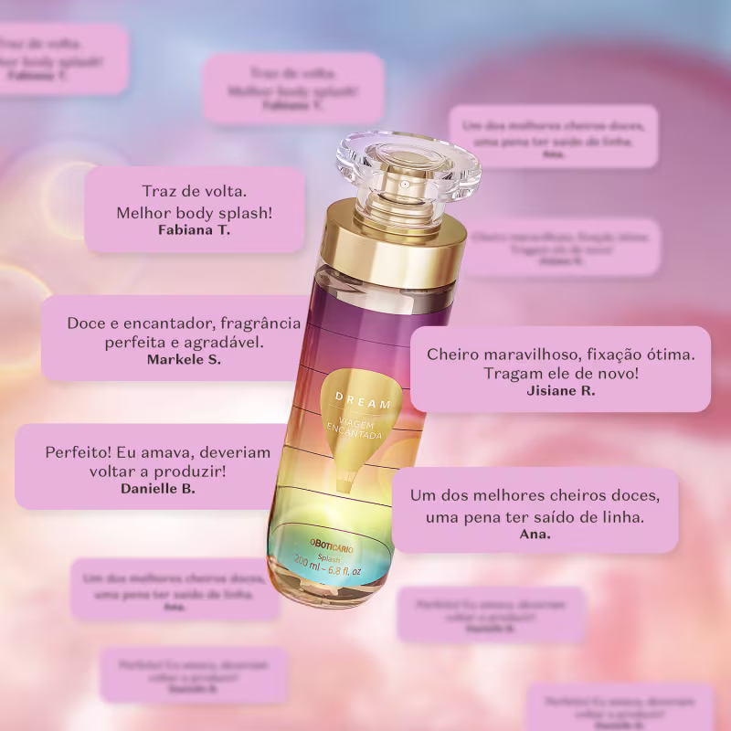 O Body Splash Desodorante Colônia Dream Viagem Encantada leva sua imaginação ao outro lado do arco-íris e mostra que a vida pode ser brilhante em uma fragrância doce que traz em suas notas olfativas a suculência da Pêra Caramelizada e o doce do Suspiro!