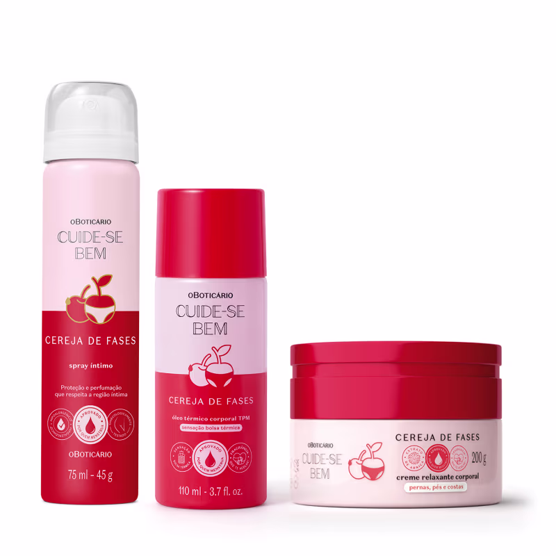 Cuide-se Bem Cereja de Fases é a linha idealizada para te apoiar durante o ciclo menstrual, inclusive na TPM. Com fragrância desenvolvida através da neurociência, os produtos combinam o cheirinho da cereja com ingredientes que promovem sensação de bem-estar e acolhimento.