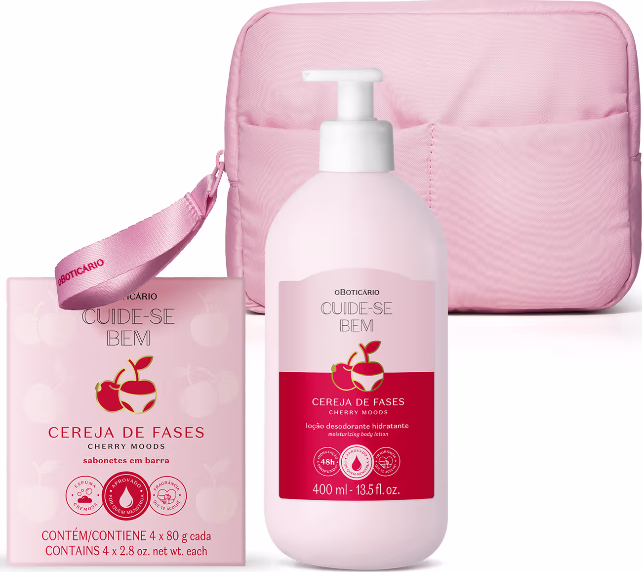 Cuide-se Bem Cereja de Fases é a linha idealizada para te apoiar durante o ciclo menstrual, inclusive na TPM. Com fragrância desenvolvida através da neurociência, os produtos combinam o cheirinho da cereja com ingredientes que promovem sensação de bem-estar e acolhimento**. Além disso, o combo também entrega um nécessaire rosa que vai ser a sua aliada em todos os momentos!