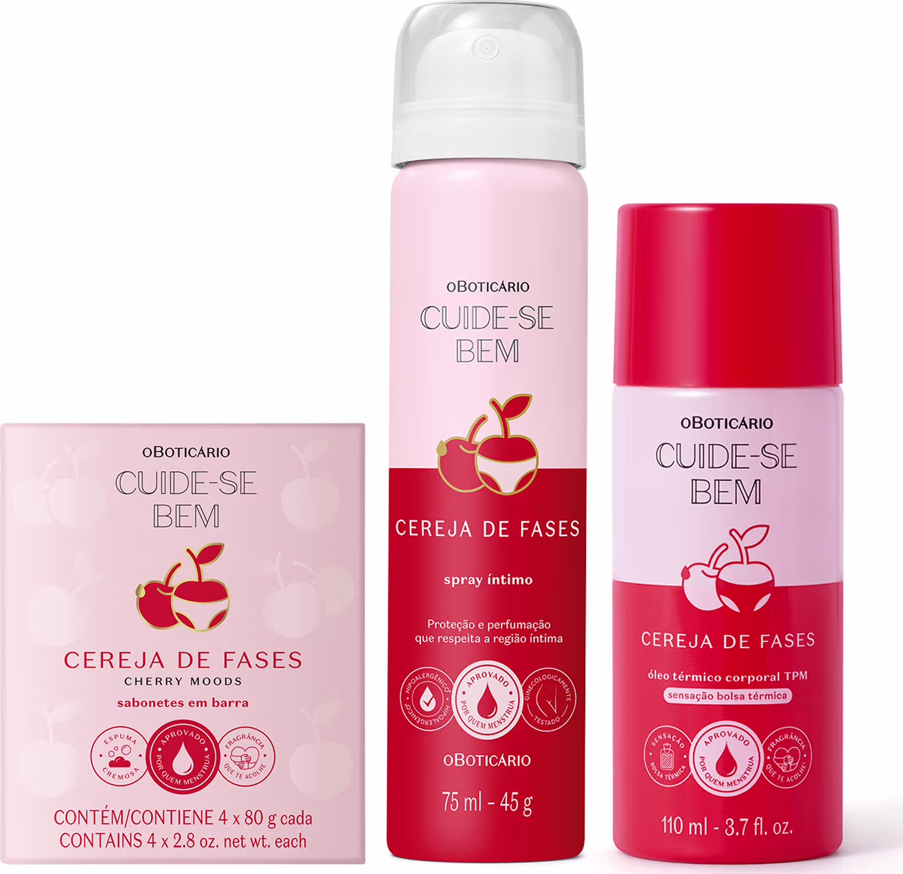Cuide-se Bem Cereja de Fases é a linha idealizada para te apoiar durante o ciclo menstrual, inclusive na TPM. Com fragrância desenvolvida através da neurociência, os produtos combinam o cheirinho da cereja com ingredientes que promovem sensação de bem-estar e acolhimento.