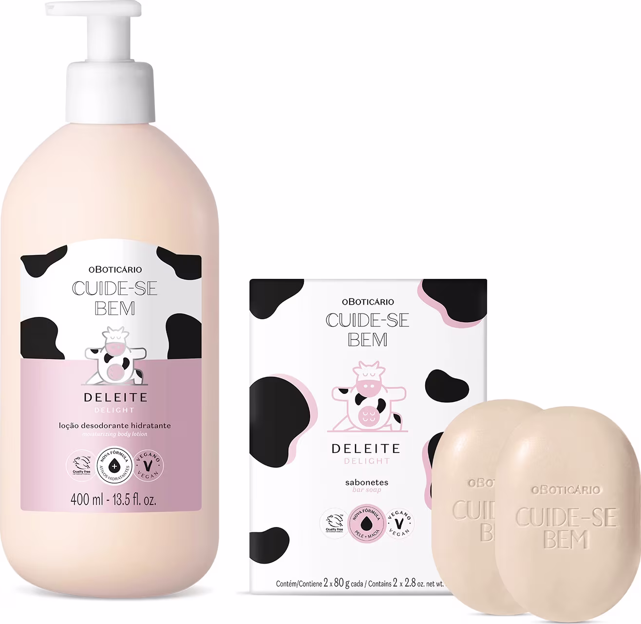 Este combo Cuide-se Bem Deleite oferece um ritual de autocuidado com a fragrância doce e envolvente da linha. A loção garante hidratação com toque aveludado , enquanto o sabonete limpa gentilmente sem ressecar.