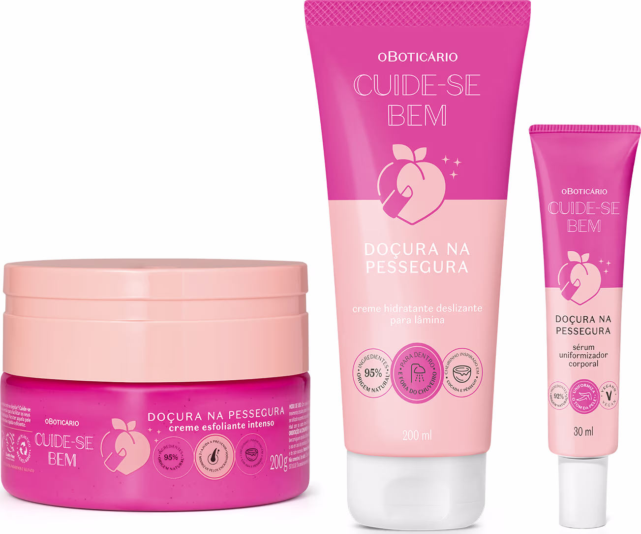 O Combo Cuide-se Bem Doçura na Pessegura oferece praticidade na hora da depilação para uma pele macia e com um cheirinho delicioso de cocada com pêssego. Composto por 3 itens, este combo garante hidratação, esfoliação e depilação. Confira os detalhes de cada produto: