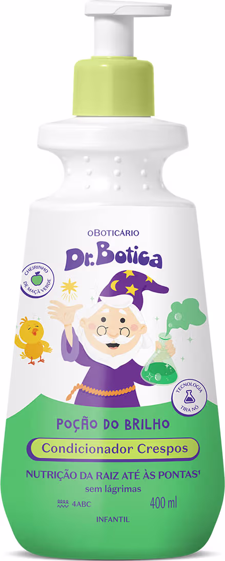 O Sabonete Líquido Infantil Dr. Botica Poção das Bolhas entrega banhos cheirosos e divertidos para rosto, mãos e corpo! Sem Lágrimas e com sensação refrescante, limpa enquanto mantém a hidratação natural da pele, tudo isso com o cheirinho de maçã verde icônico de Dr. Botica, O Boticário! A embalagem acessível³, com pump amarelo, foi desenvolvida com PcD nos membros superiores, melhorando a identificação do produto para pessoas com baixa visão.