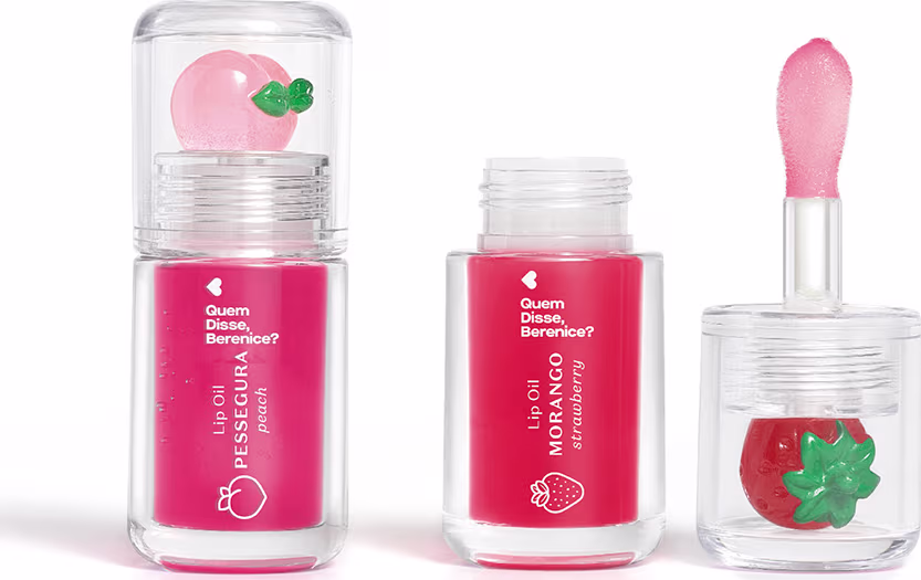 A linha Cuide-se Bem Feira + Quem Disse, Berenice? mescla a leveza das frutas com o visual impecável que você adora. Este agrupamento de dois lip oils vem com um aplicador encantador com o desenho da fruta, assegurando bocas nutridas e vibrantes sempre que precisar. Conheça cada brilho labial com essência frutal:1