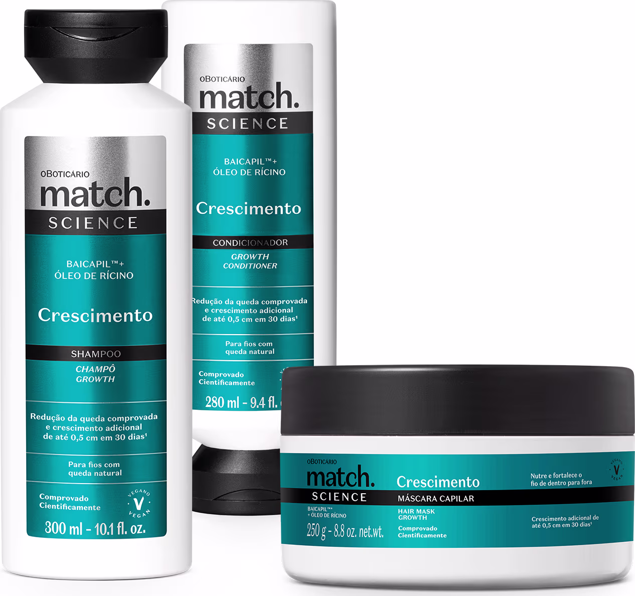 O Combo Match Science Crescimento combina ativos de alta performance, como Baicapil® e Óleo de Rícino, para tratar os fios e o couro cabeludo, proporcionando resultados visíveis em 30 dias*. Uma rotina completa para estimular o crescimento saudável dos fios, da raiz às pontas.