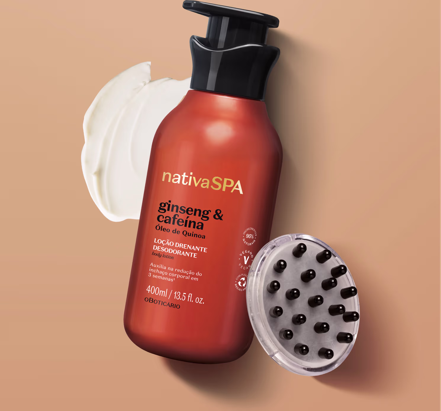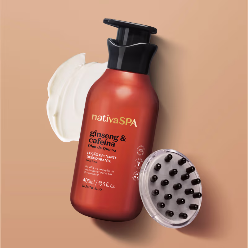 Após o banho, massageie o corpo com a Loção Drenante Desodorante Nativa SPA Ginseng e Cafeína Corporal para reduzir visivelmente o inchaço no corpo. A fórmula com Óleo de Quinoa aumenta o colágeno e traz firmeza à pele e ainda garante hidratação e nutrição profunda.