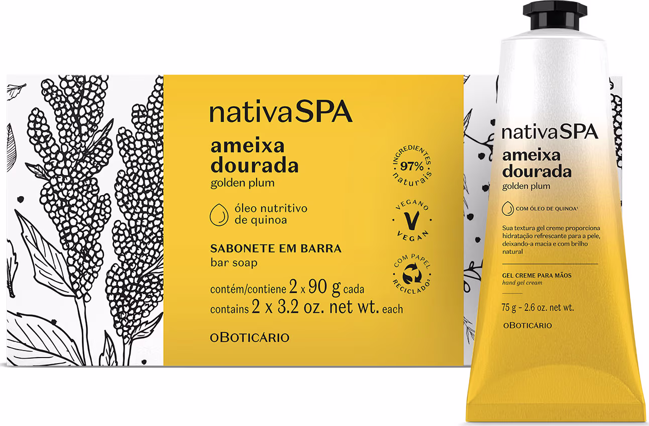 Combo Presente Nativa SPA Ameixa Dourada: Sabonete em Barra 2x90g + Gel Creme Mãos 75g