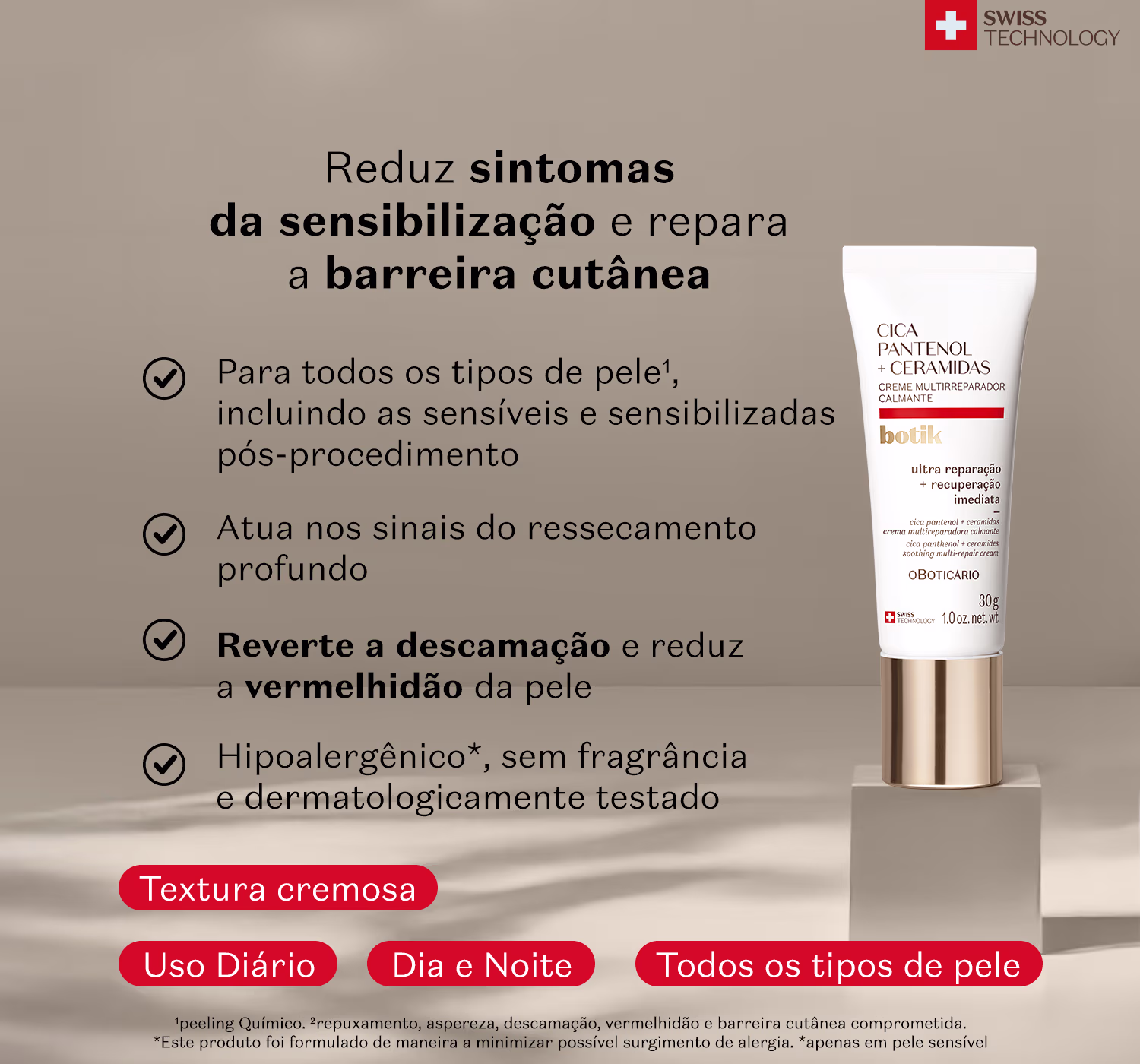 O Creme Multirreparador Facial Cica Pantenol e Ceramidas foi desenvolvido para peles secas e ultra secas, incluindo as sensíveis e sensibilizadas pós procedimento estético¹ como peeling químico, atuando diretamente nos 5 sinais do ressecamento profundo²: repuxamento, aspereza, descamação, vermelhidão e barreira cutânea comprometida.