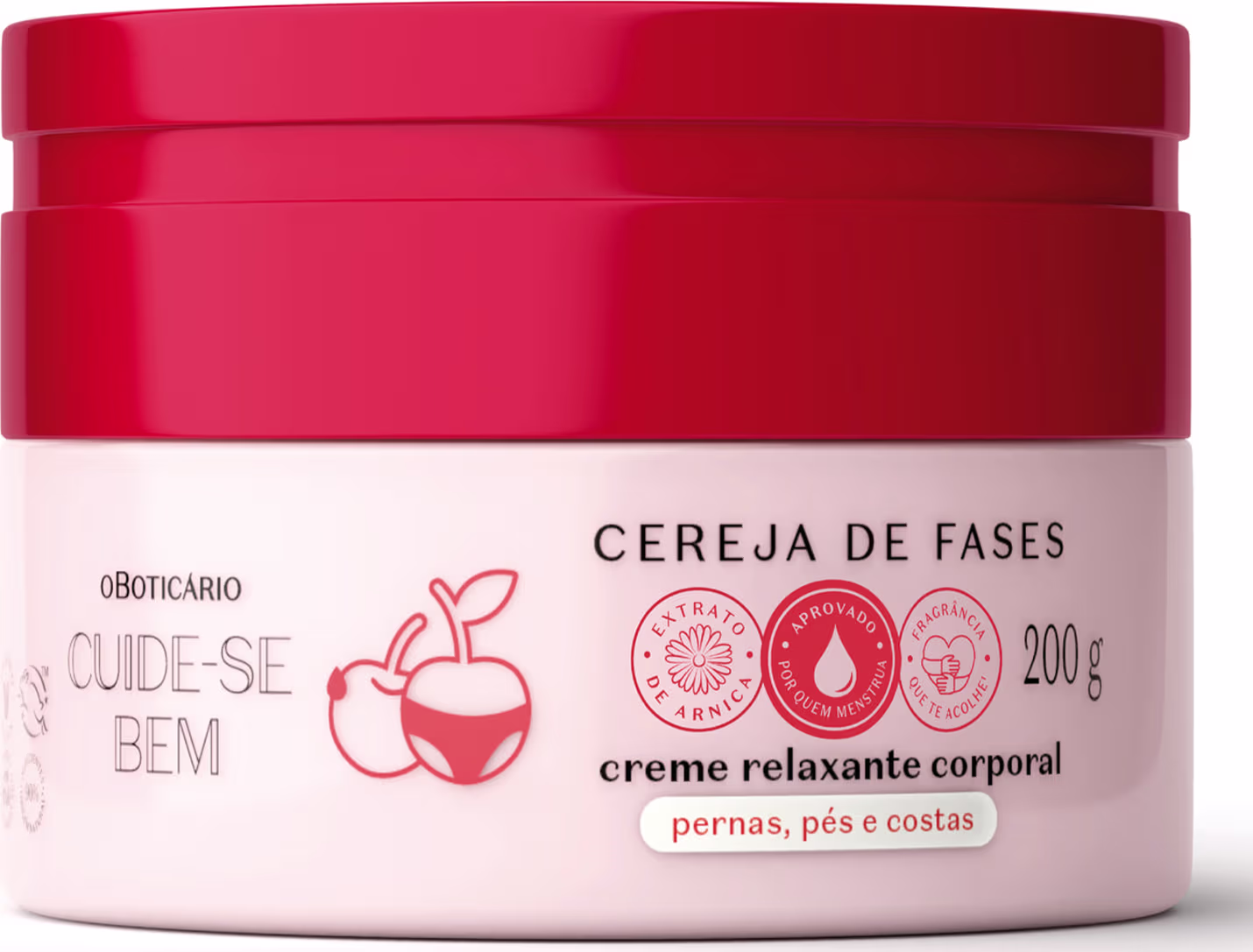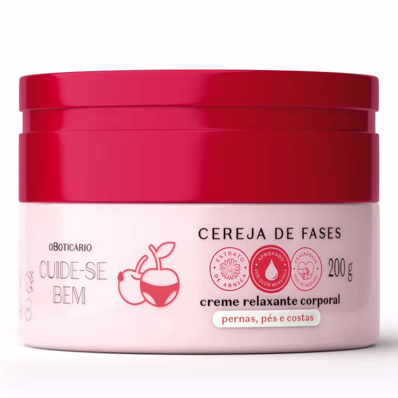Aprovado por quem menstrua,o Creme Relaxante Corporal Cuide-se Bem Cereja De Fases é o seu aliado para aliviar desconfortos com o Extrato de Arnica, conhecido ingrediente para relaxamento na lombar e nas costas.