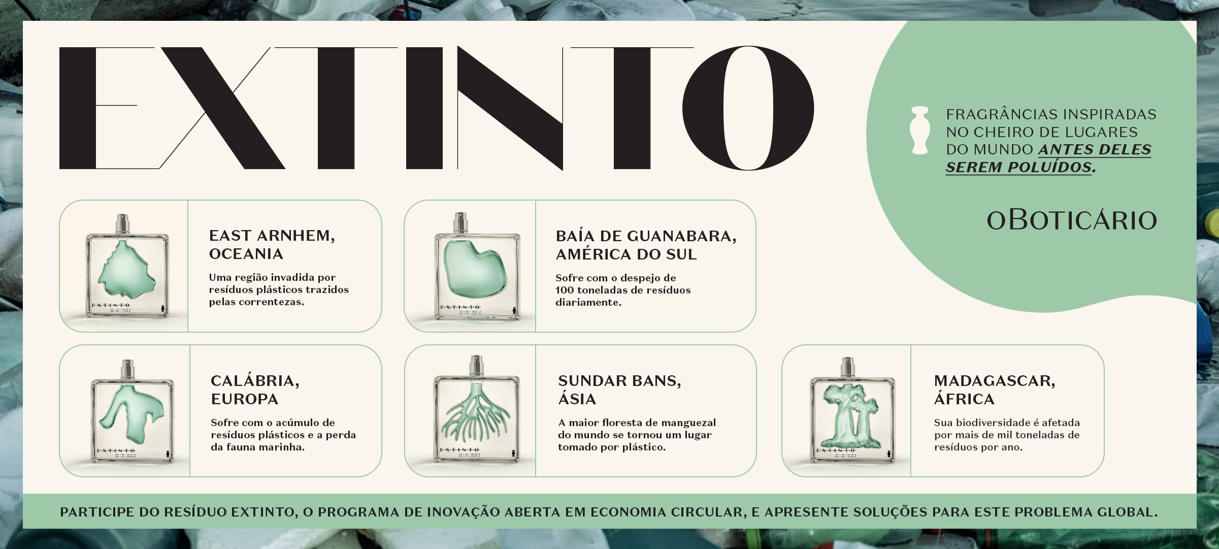 Para potencializar ainda mais esse chamado, O Boticário, em parceria com a Artemisia, lança o programa de inovação aberta de impacto socioambiental Resíduo Extinto, que tem como objetivo fomentar soluções inovadoras relacionadas aos desafios de Economia Circular, com foco principal na gestão de resíduos sólidos.