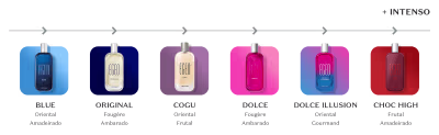 Egeo Blue: Oriental Amadeirado, traz um mix compartilhável super atraente de Malte (sim, tipo cerveja!), Cardamomo, madeiras e Baunilha. Um toque sofisticado e misterioso.