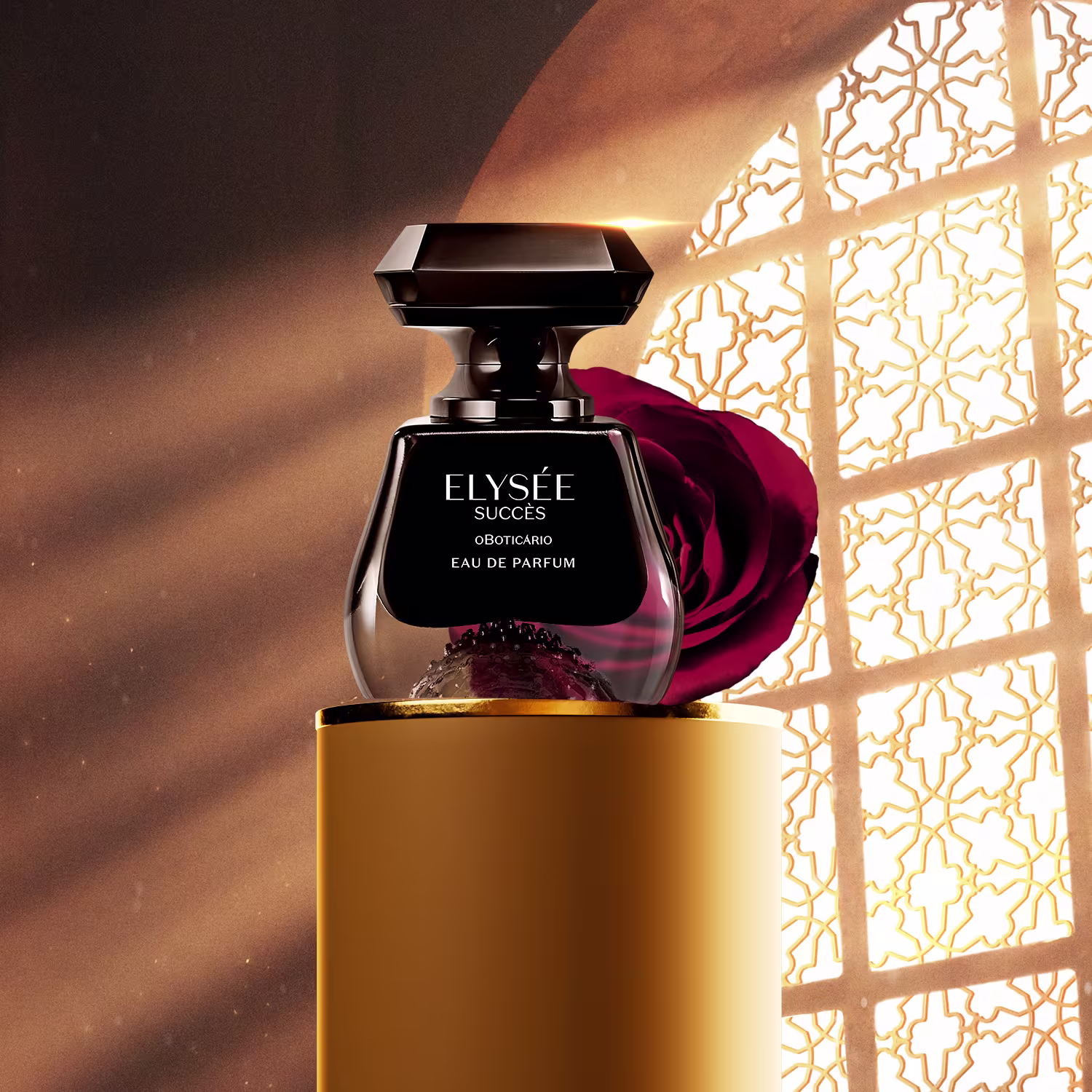 A embalagem de Elysée Succès remete à joia, característica da marca que completa a sofisticação do produto. O frasco também é inspirado no ingrediente principal da fragrância, a Rosa Negra, e traz uma pintura interna que revela toda a força interna e originalidade da mulher.