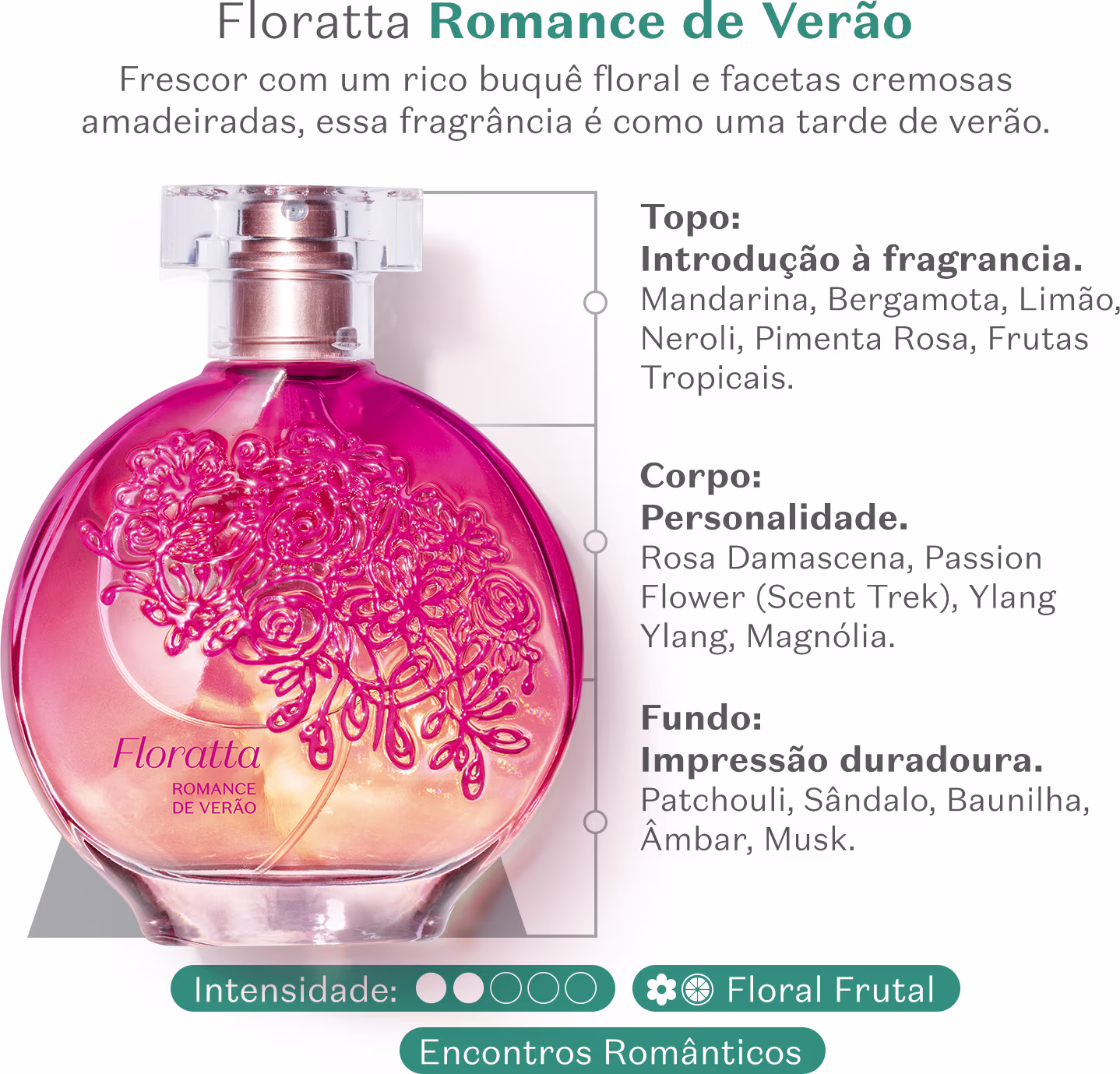 Por isso, criou Floratta Romance de Verão Desodorante Colônia, uma fragrância da perfumaria feminina adocicada na medida certa e inspirada em flores e frutas tropicais, com um frescor intenso como um romance de verão.