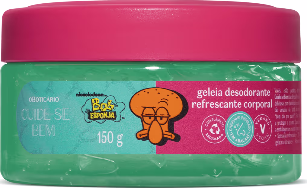 Cuide-se Bem descobriu a fórmula secreta ideal para o seu momento de cuidado com a pele! Em edição limitada, a Geleia Desodorante Refrescante Corporal Bob Esponja Lula Molusco vai fazer parte da sua rotina de autocuidado oferecendo hidratação para a pele com toque refrescante e um cheirinho delicioso inspirado no abacaxi¹!