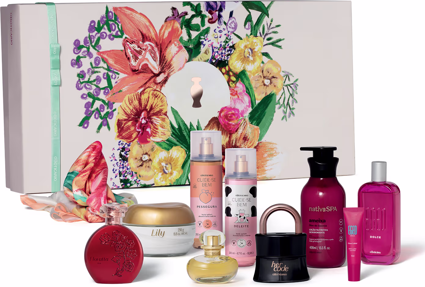 Perfumaria de presente agrada a todos! Esse kit contém 6 inesquecíveis fragrâncias para as melhores ocasiões: o floral branco de Lily O boticário, a fragrância envolvente de Her Code , o floral frutal de Floratta Red, e a fragrância doce de Egeo Dolce,. Para entregar leveza e refrescância no dia dia, traz os body splashes de Cuide-Se Bem Deleite e Cuide-Se Bem Pessegura.