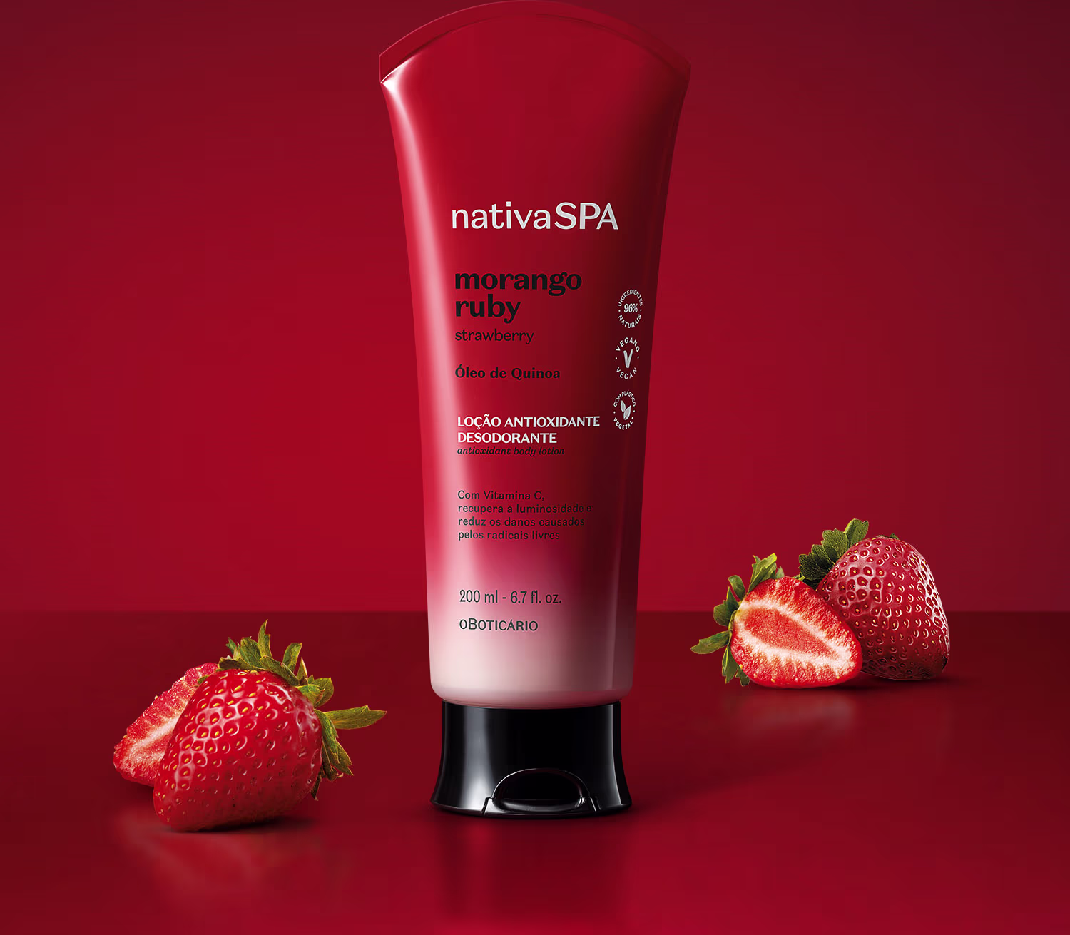 Máxima hidratação combinada com um cheirinho irresistível, assim é a Loção Antioxidante Desodorante Corporal Nativa SPA Morango Ruby!