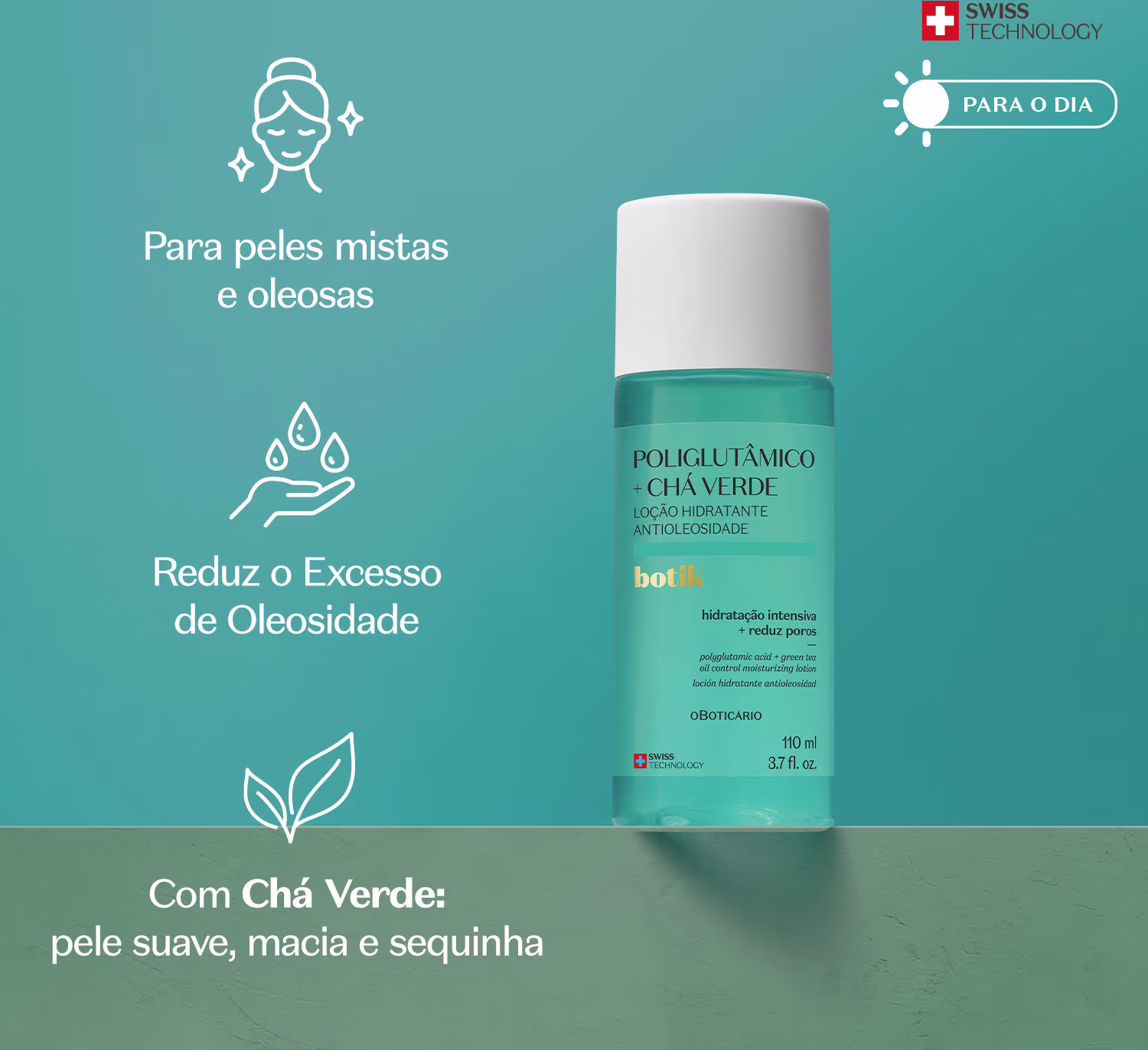 Idealizada com Tecnologia Suíça e os melhores ativos para manter sua pele mais lisa e com menos poros e linhas finas, a Loção Hidratante Antioleosidade Ácido Poliglutâmico + Chá Verde Botik é um dermocosmético ideal para a sua rotina de skincare.