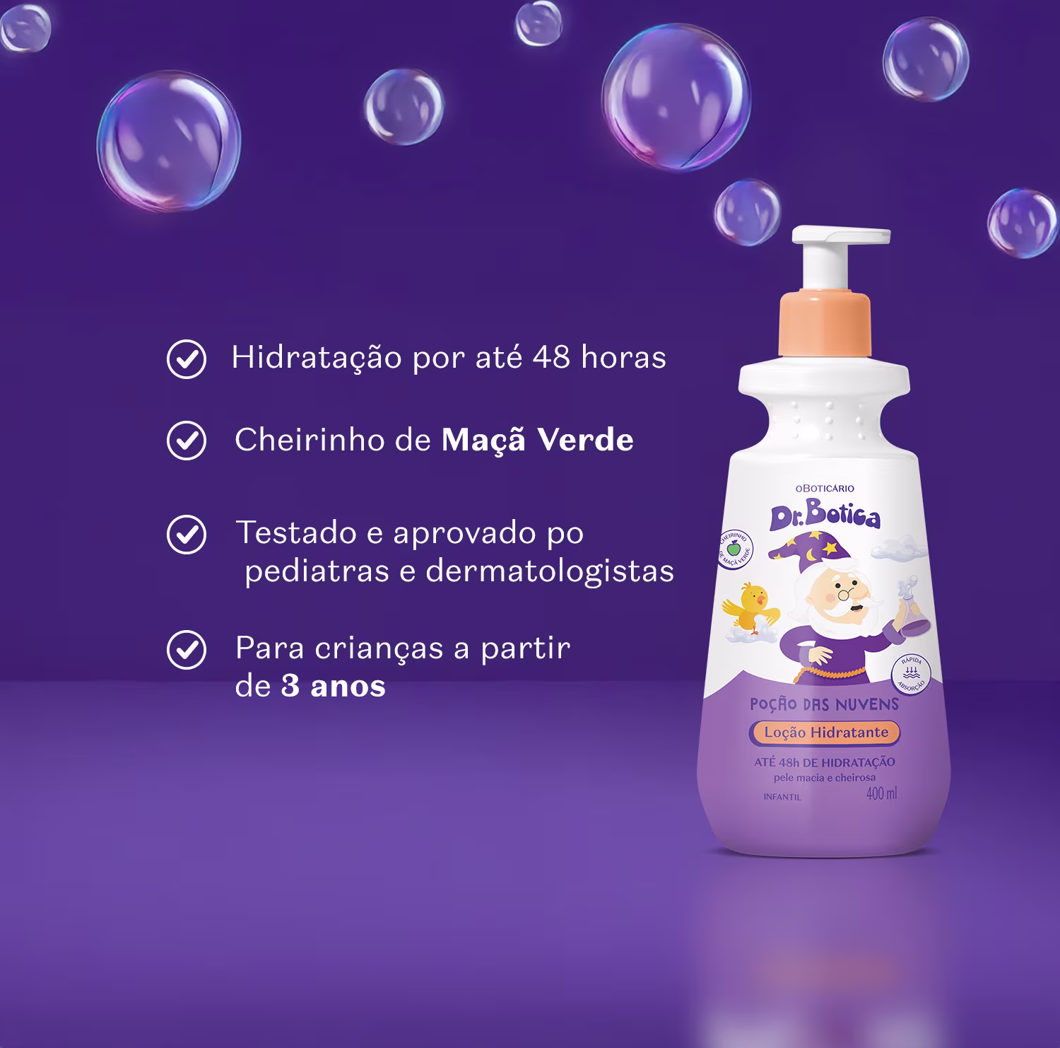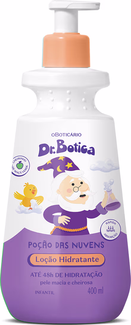 A Loção Hidratante Desodorante Corporal Dr.Botica Poção das Nuvens deixa a pele do corpo e do rosto macia e cheirosa com o cheirinho de maçã verde icônico de Dr. Botica O Boticário!