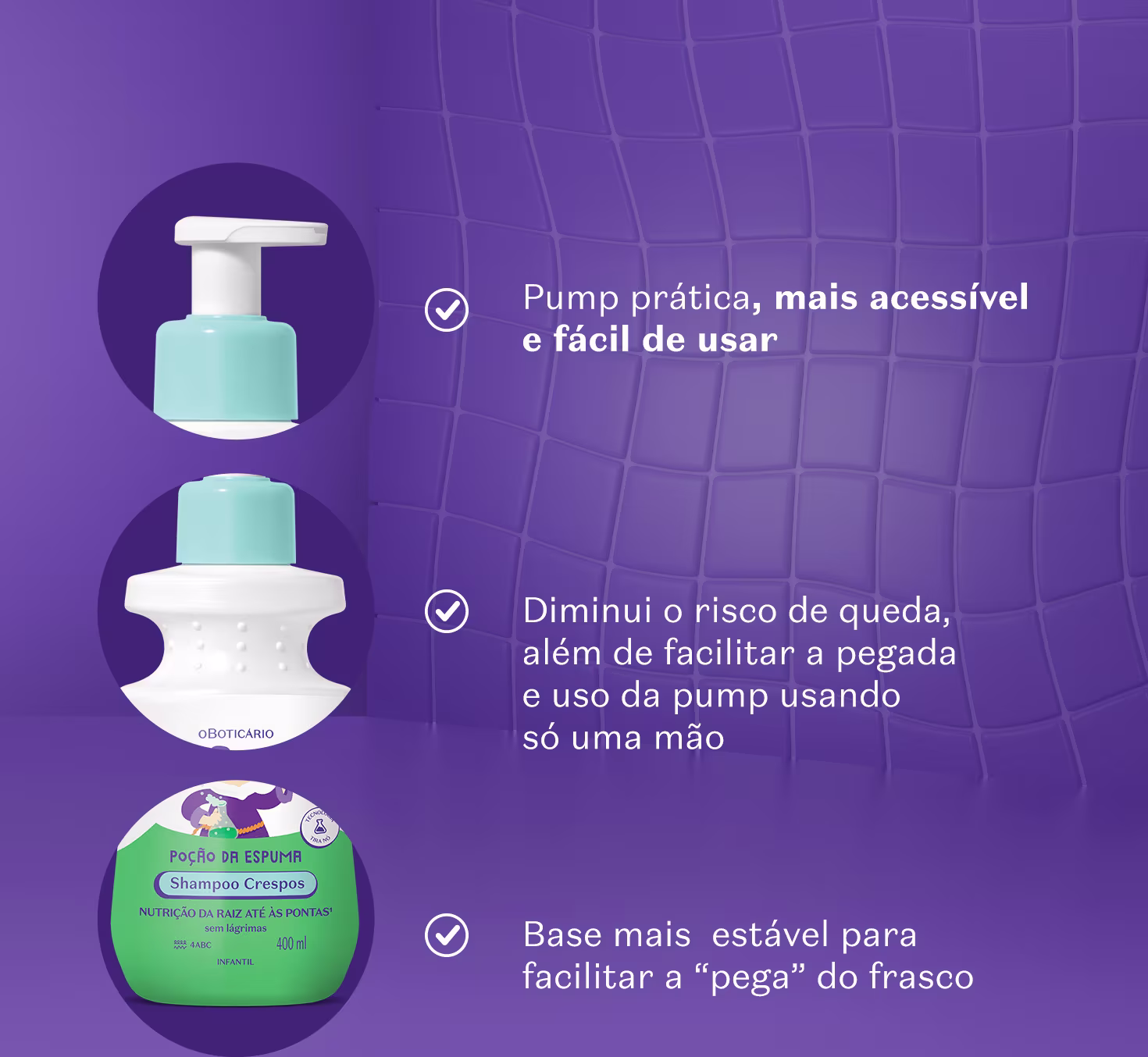 Além do formato ergonômico do frasco, que pode facilitar o uso por parte de pessoas com deficiência nos membros superiores, as embalagens possuem um sistema de cores no pump e etiquetas nas laterais que facilitam a identificação dos produtos para pessoas com baixa visão: a cor laranja no pump indica que é um loção corporal infantil.