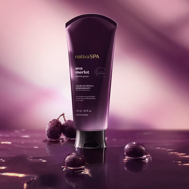 Nativa Spa O Boticário te convida a experimentar sua máxima potência ao degustar desse encontro a sós consigo mesma, acompanhada de Nativa Spa Uva Merlot. Uma fragrância magnética e envolvente que promove confiança⁶ com o exclusivo Acorde Merlot Essence. Nativa Spa é a primeira marca do mundo que utiliza o óleo de quinoa para estimular a produção de colágeno na pele⁵.