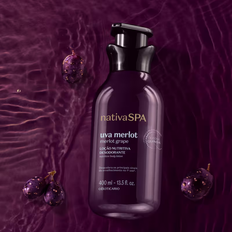 A Loção Nutritiva Desodorante Nativa Spa Uva Merlot te convida a degustar o prazer da sua própria companhia com a potência de um tratamento que desacelera os principais sinais do tempo desde o primeiro uso¹, recuperando o tempo que sempre foi seu.