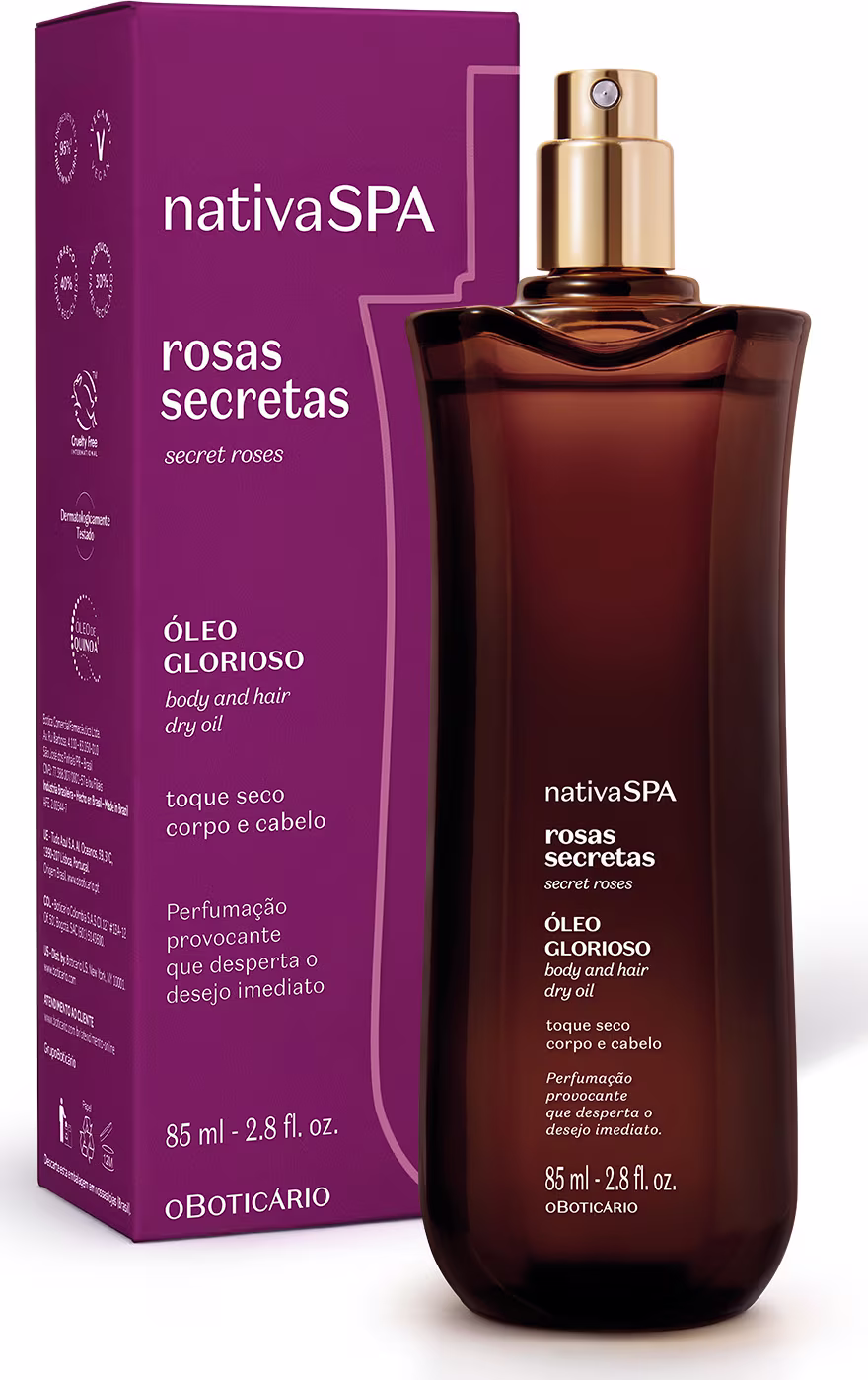 O Óleo Multifuncional Glorioso Corpo E Cabelos Nativa Rosas Secretas traz uma perfumação provocante, capaz de despertar o desejo imediato*. Como toque final, a potência do óleo multifuncional entrega altíssima perfumação em óleo seco.
