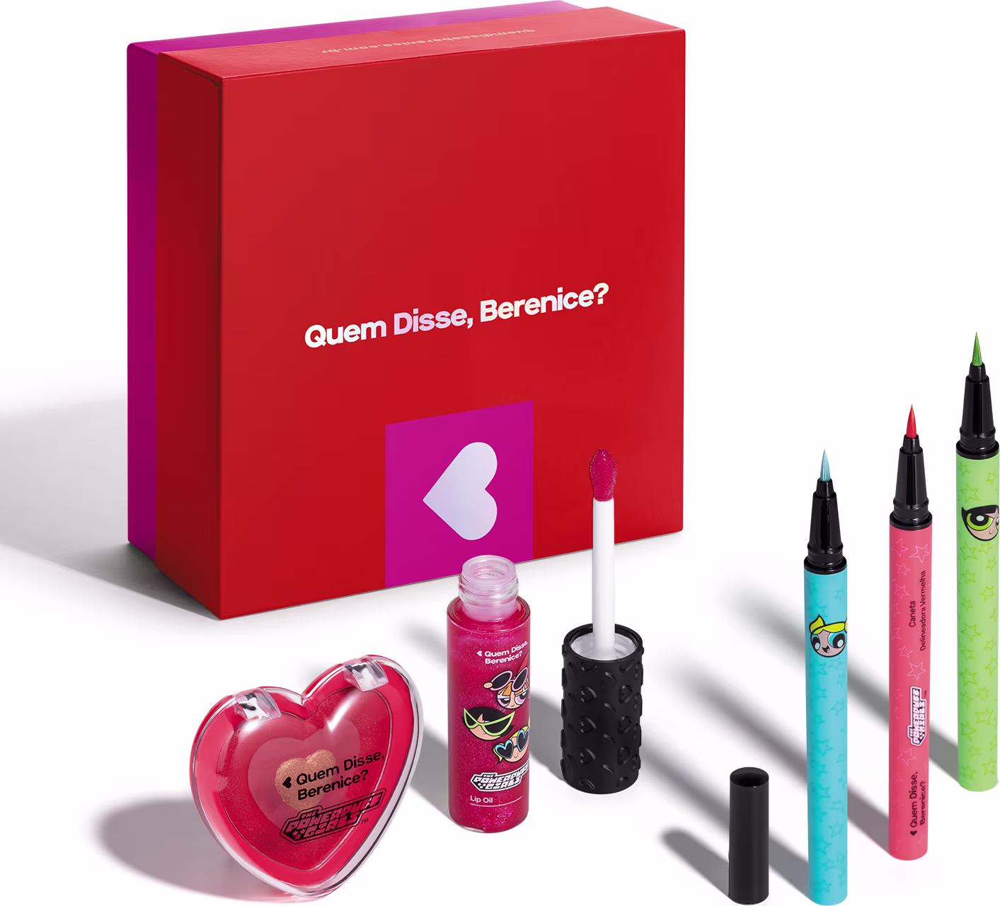 Não sei o CEPQuem disse, Berenice? e as Meninas Superpoderosas uniram forças para criar a collab perfeita para quem ama ousar na maquiagem! Este combo de maquiagem traz o Lip Oil Rosa, o Kit de Canetas Delineadoras e o blush compacto, inspirados nas cores e na força das heroínas de Townsville. Além disso, vem com uma caixa de presente super charmosa. Prepare-se para presentear com a força das Meninas Superpoderosas.