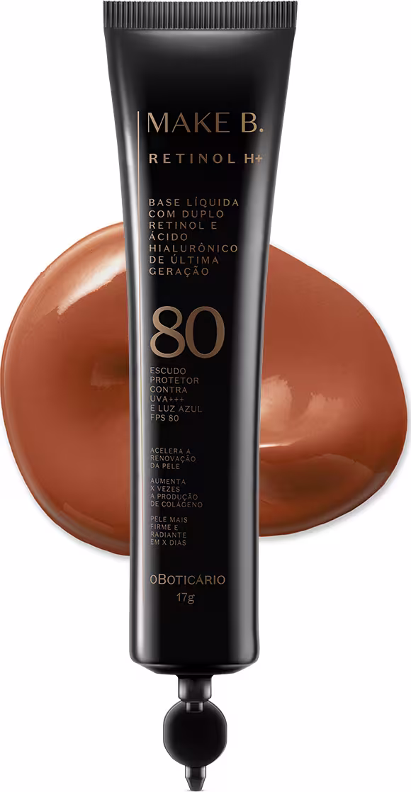 A Base Líquida Invisível com FPS 80 Make B. Retinol H+ que combina Duplo Retinol com Ácido Hialurônico Vetorizado e fator de proteção contra os raios UV agora tem refil!