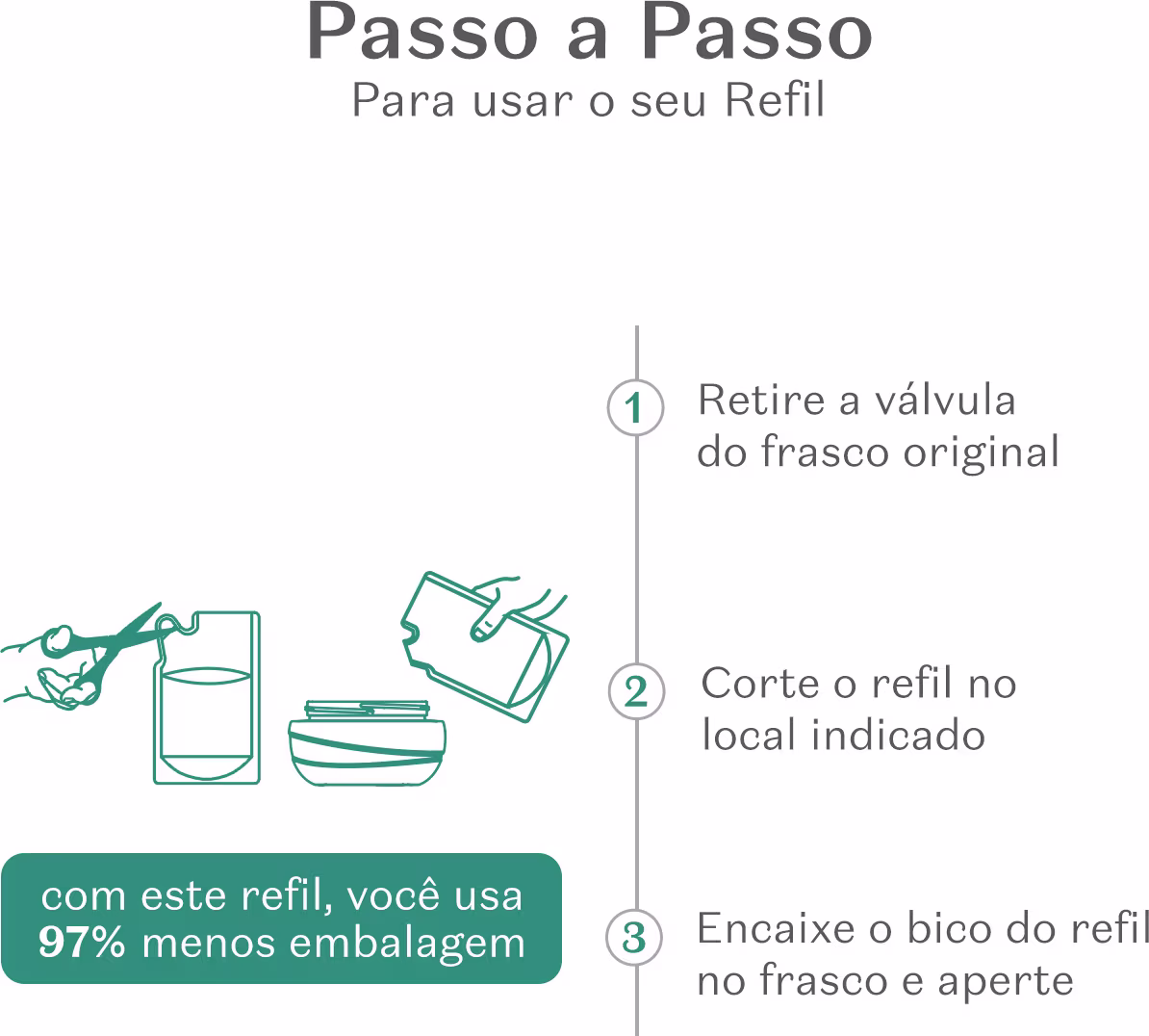 **Ao usar o refil de Lily você reaproveita o seu frasco de creme acetinado e diminui o volume de plástico, vidro e papel descartados, reduzindo assim em 97% a quantidade de material de embalagem em comparação com o produto regular.