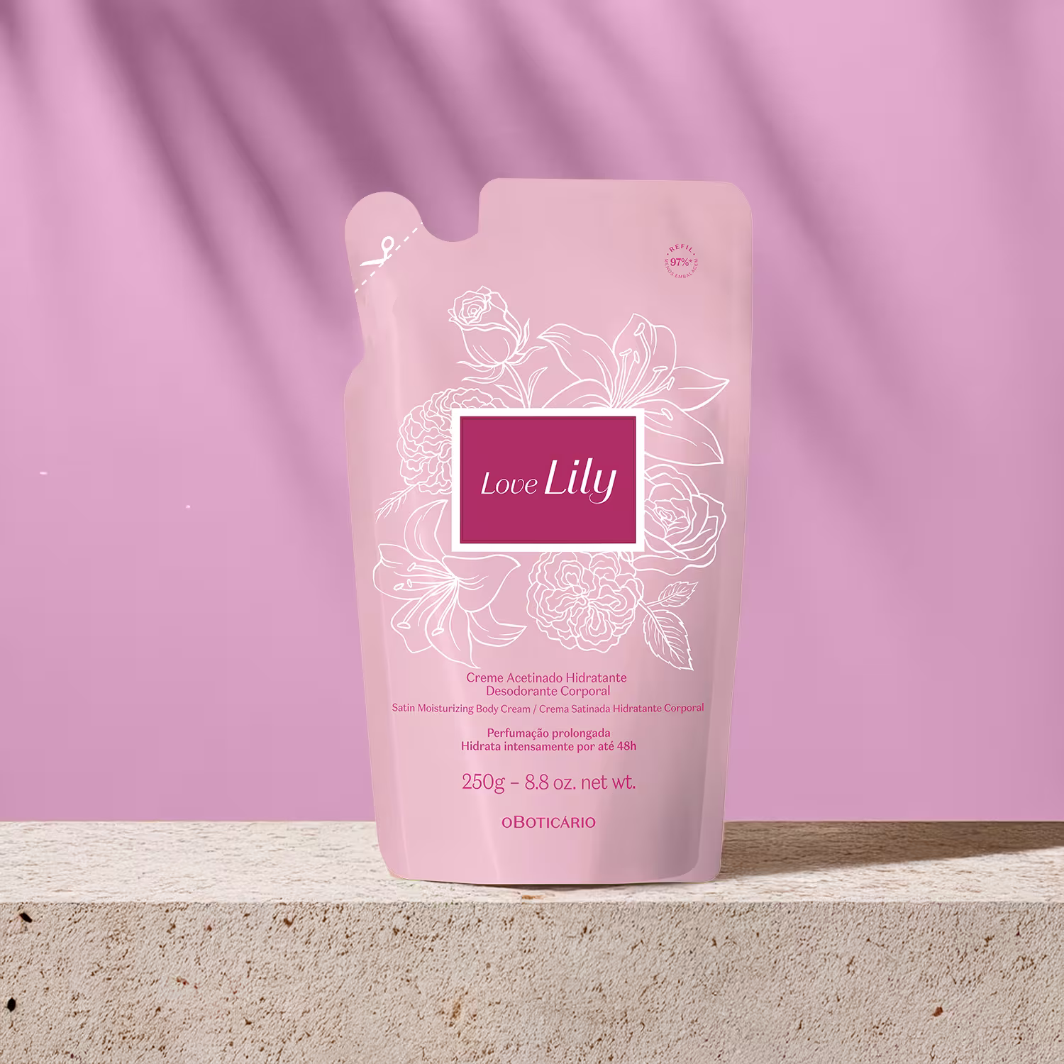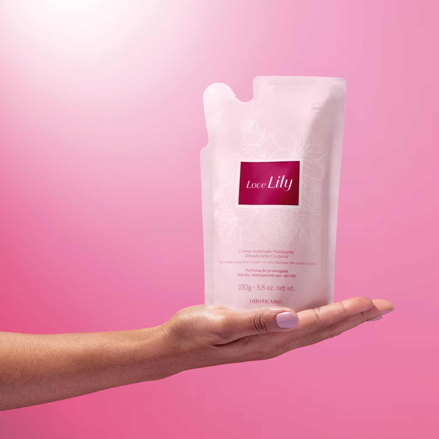 Em embalagem refil, o Refil Creme Acetinado Desodorante Hidratante Corporal Love Lily traz fragrância e economia para você sempre ter em mãos seu hidratante preferido.