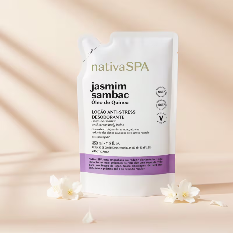 Não sei o CEPA Loção Hidratante Desodorante Corporal Anti-stress Nativa SPA Jasmim Sambac atua na redução dos danos causados pelo stress na pele. Nativa SPA está empenhada em reduzir diariamente o seu impacto no meio ambiente: os refis dão uma segunda vida para seu frasco de loção. Nossa embalagem de refil usa 78% menos plástico que a do produto regular.