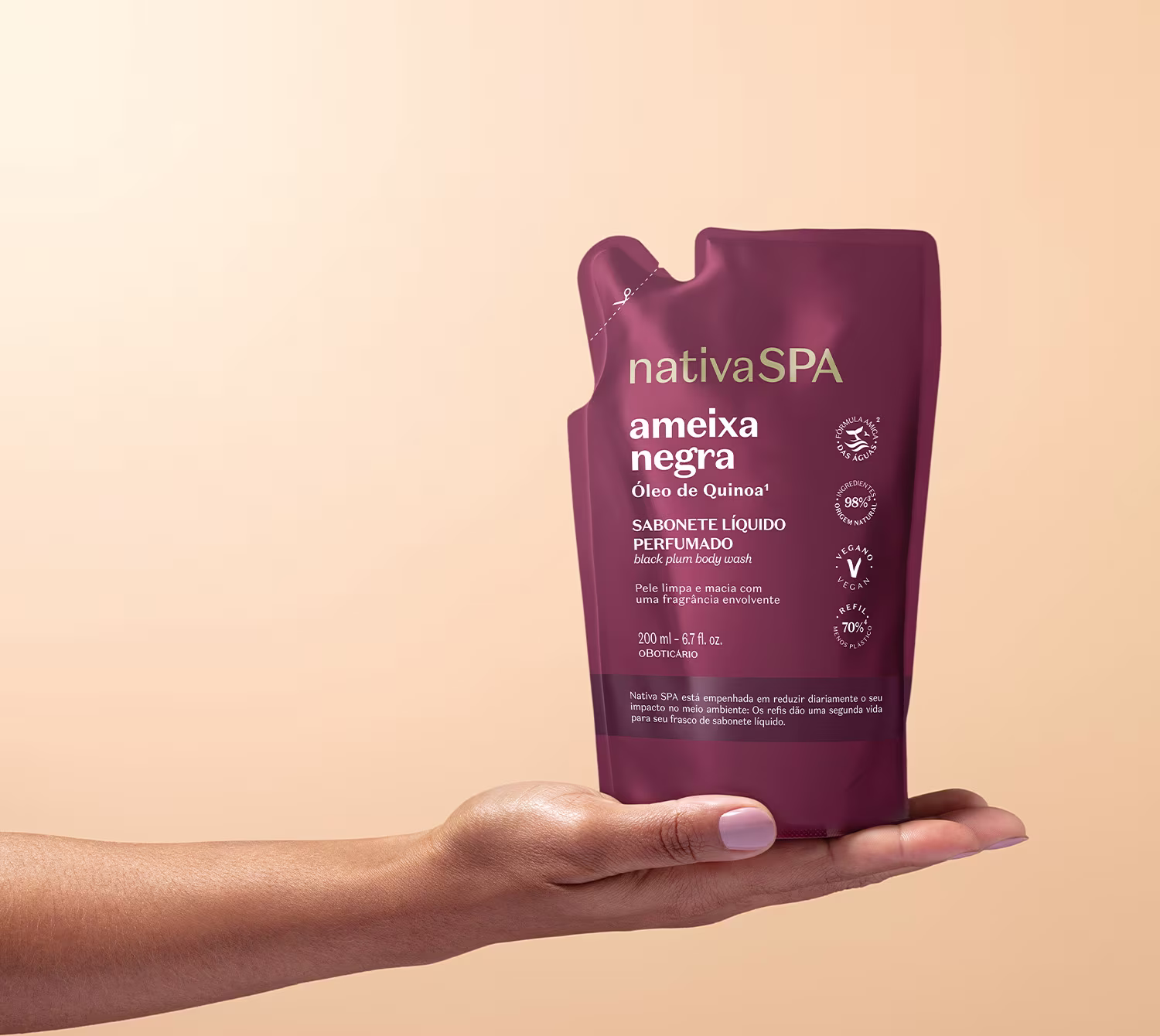 O Refil Sabonete Líquido Perfumado Nativa Spa Ameixa Negra dá uma segunda vida para seu frasco de sabonete líquido, que entrega um banho de frescor com sua fragrância favorita. Com menos 70% de plástico¹, Nativa SPA está empenhada em reduzir diariamente o seu impacto no meio ambiente