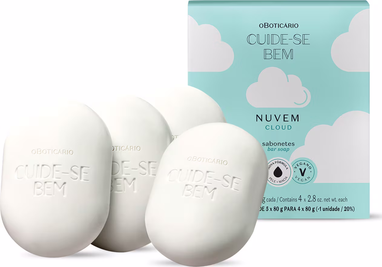 Kit com 4 sabonetes Cuide-se Bem Nuvem, com cheirinho fresco e um conforto que vai te deixar nas nuvens. Ver mais ❯