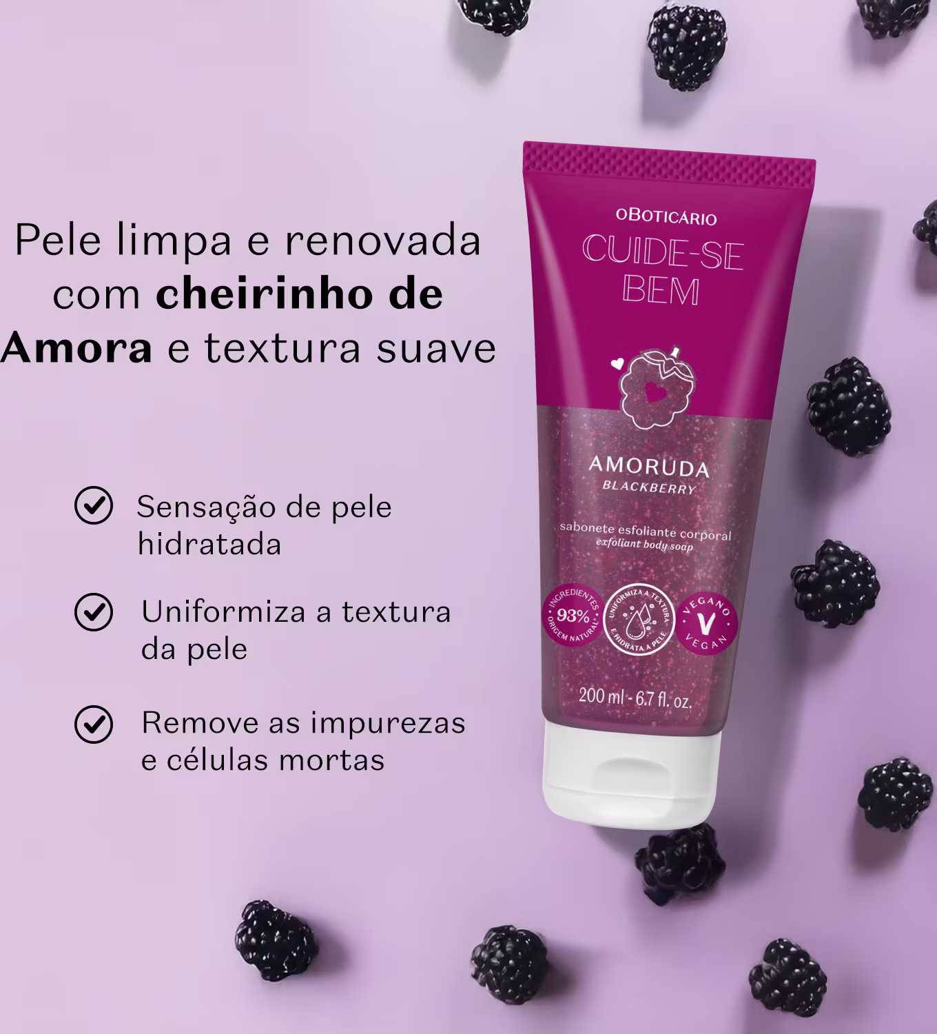 Com o cuidado e a fragrância da amora, o Sabonete Esfoliante Corporal melhora a textura da pele, deixando-a suave e uniforme, para você viver com toda a abundância que merece;