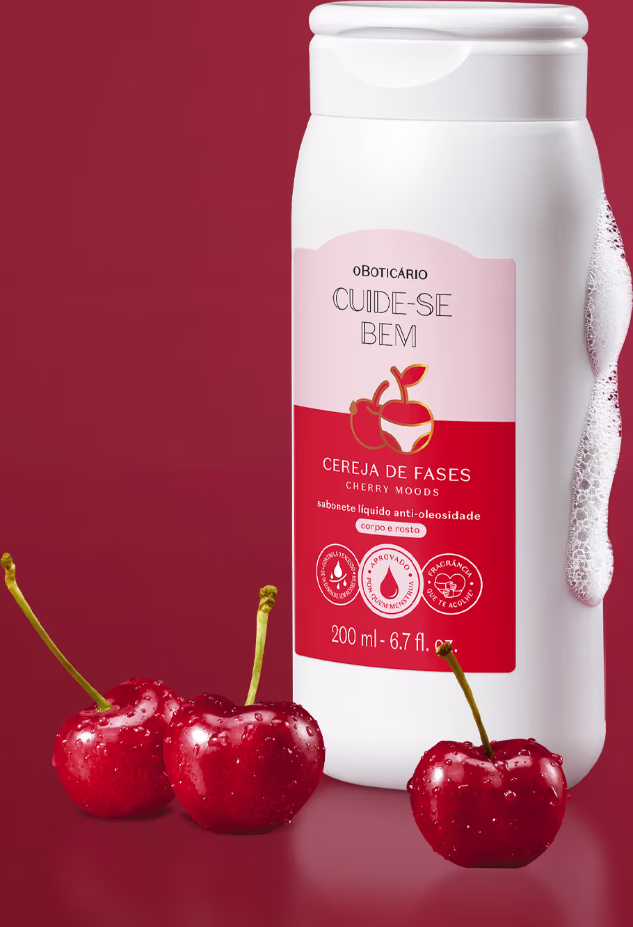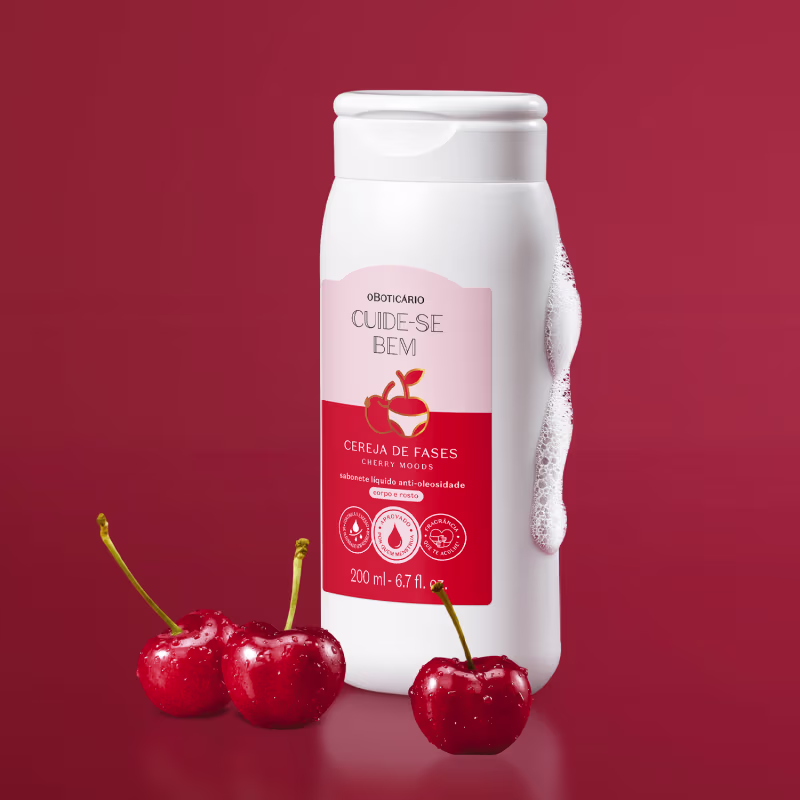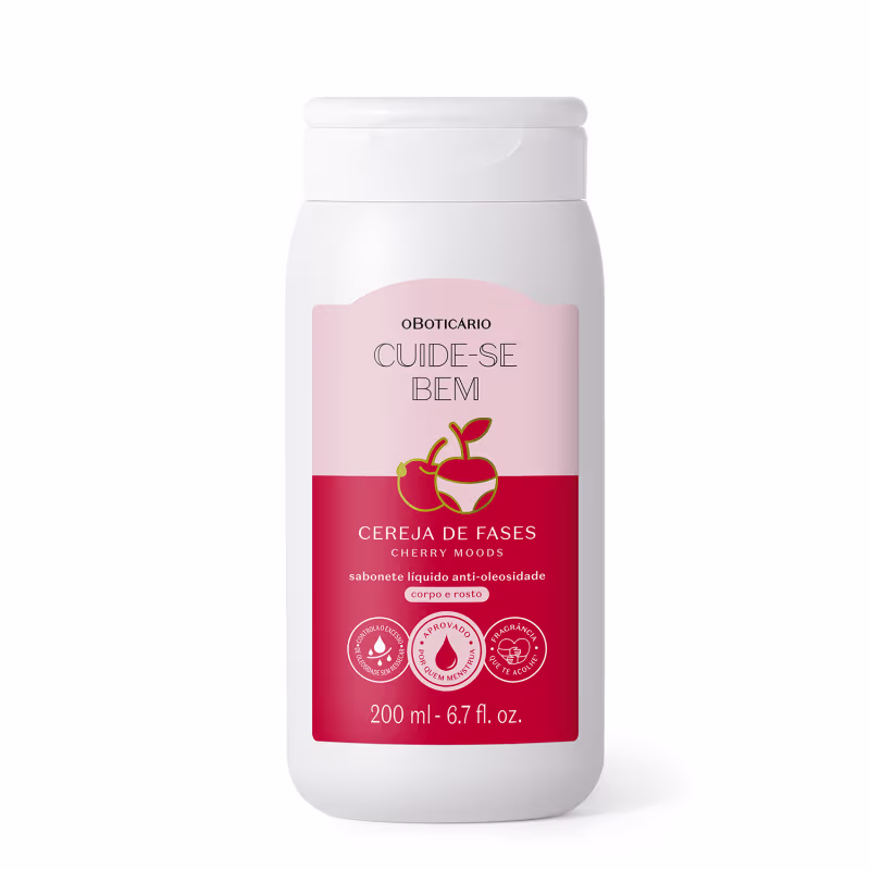 Aprovado por quem menstrua, o Sabonete Líquido Anti-Oleosidade Corpo E Rosto Cuide-se Bem Cereja De Fases limpa sem ressecar o corpo e rosto com fragrância que te acolhe*** em um floriental frutal envolvente e textura em gel, e tornando os dias de ciclo mais leves e confortáveis.