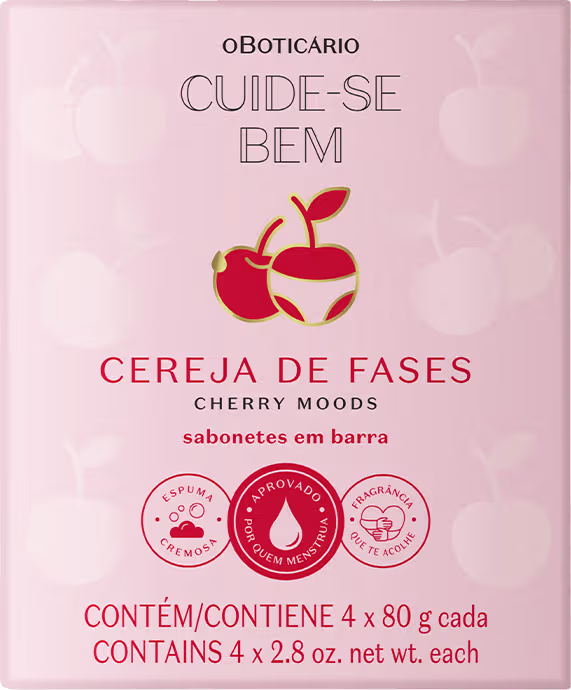 Aprovado por quem menstrua, o Kit Sabonetes Em Barra Cuide-se Bem Cereja De Fases limpa a pele sem ressecar com espuma cremosa,  entregando pele macia suave e aveludada.