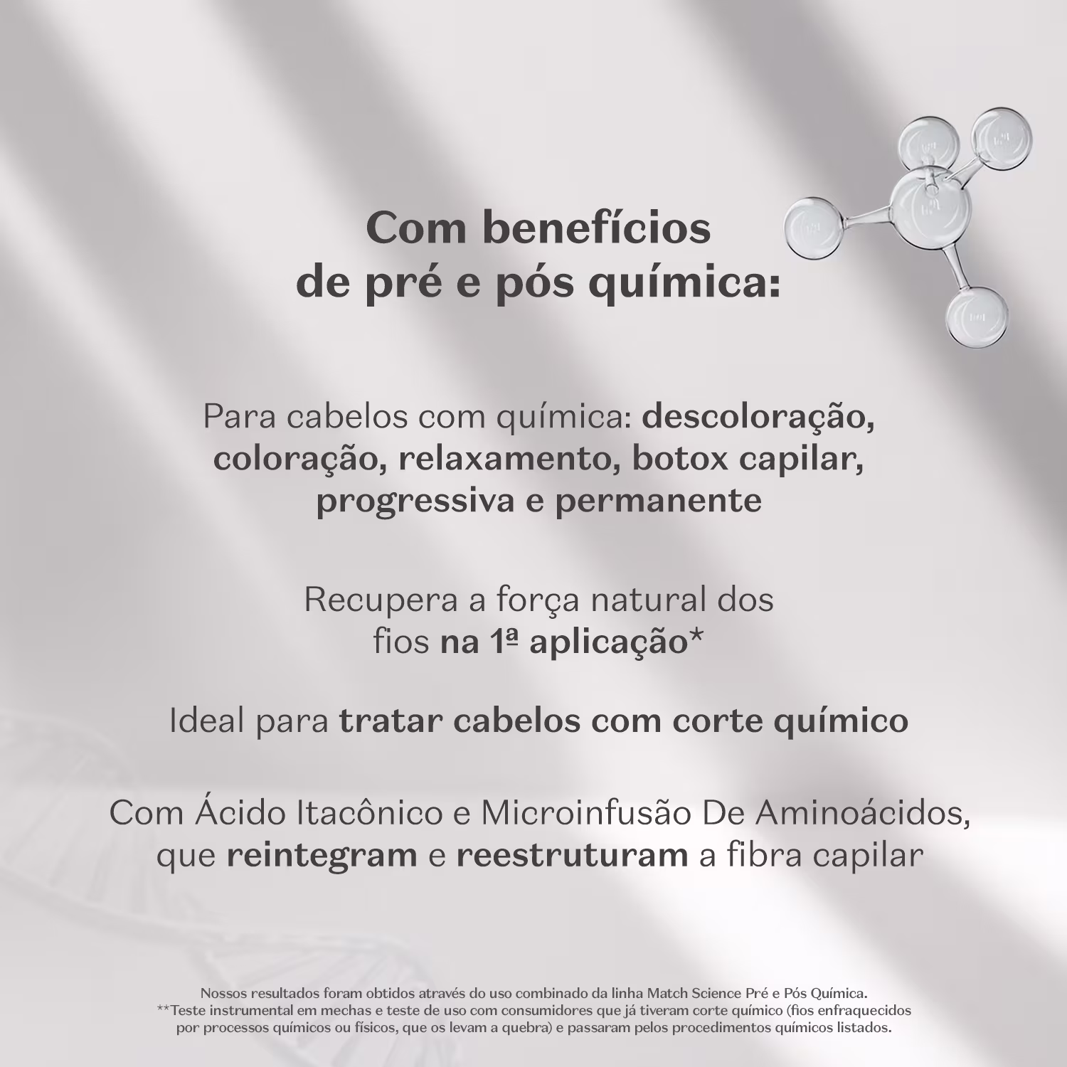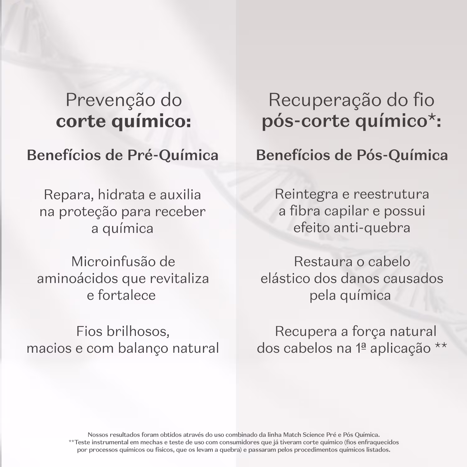 Ideal para recuperar o fio pós corte químico é fios enfraquecidos por química, Match Science Pré e Pós Química é uma linha de produtos para cabelos quimicamente tratados que auxilia na prevenção do corte químico e recupera a força natural dos fios na 1ª aplicação*. Com benefícios de Pré e Pós Química em uma única linha, traz ativos de alta performance e resultados comprovado cientificamente .